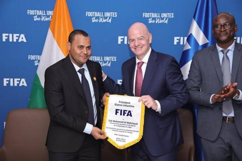 وقد تم خلال هذا اللقاء الموقر توقيع عدد من اتفاقيات التعاون بين الاتحاد الدولي لكرة القدم وجمهورية النيجر، والتي شملت مجالات تطوير البنيات التحتية الرياضية، وإعداد وتأهيل الأطر التقنية، وتعزيز كرة القدم القاعدية، وذلك في سياق رؤية “فيفا فورورد” التي تهدف إلى دعم الاتحادات الوطنية، وتوسيع قاعدة ممارسة كرة القدم على الصعيد العالمي.