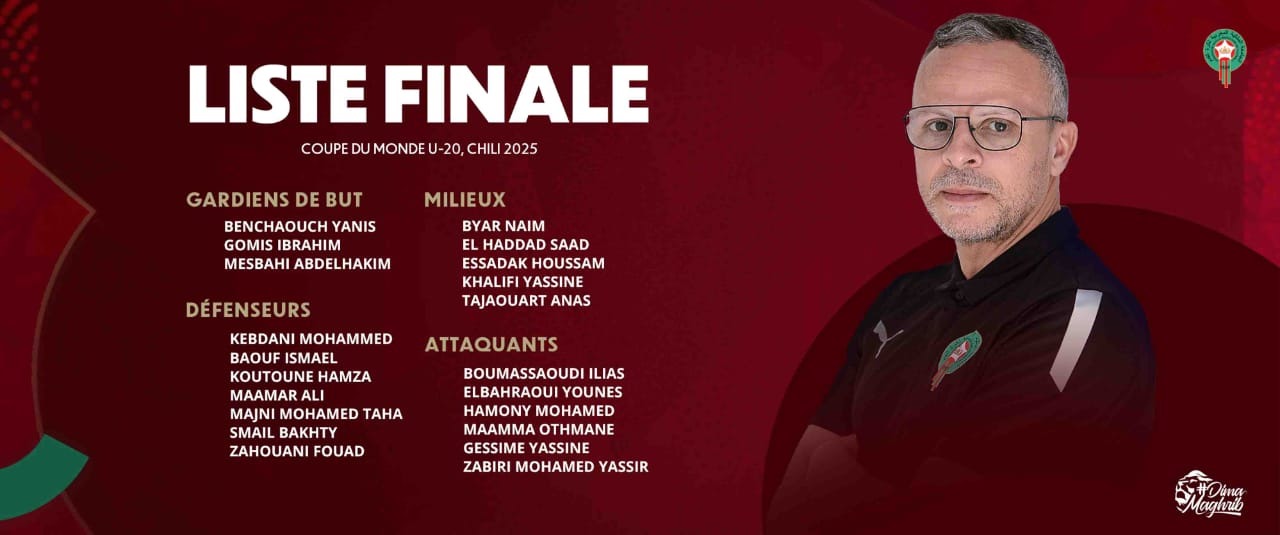 كشف مدرب المنتخب الوطني لأقل من 20 سنة، السيد محمد وهبي، يومه الجمعة خلال الندوة الصحفية التي أقيمت بمركز محمد السادس لكرة القدم بالمعمورة، عن لائحة تضم واحداً وعشرين لاعباً تم استدعاؤهم للمشاركة في نهائيات كأس العالم لأقل من 20 سنة التي ستقام في الشيلي ما بين 27 شتنبر و19 أكتوبر 2025.