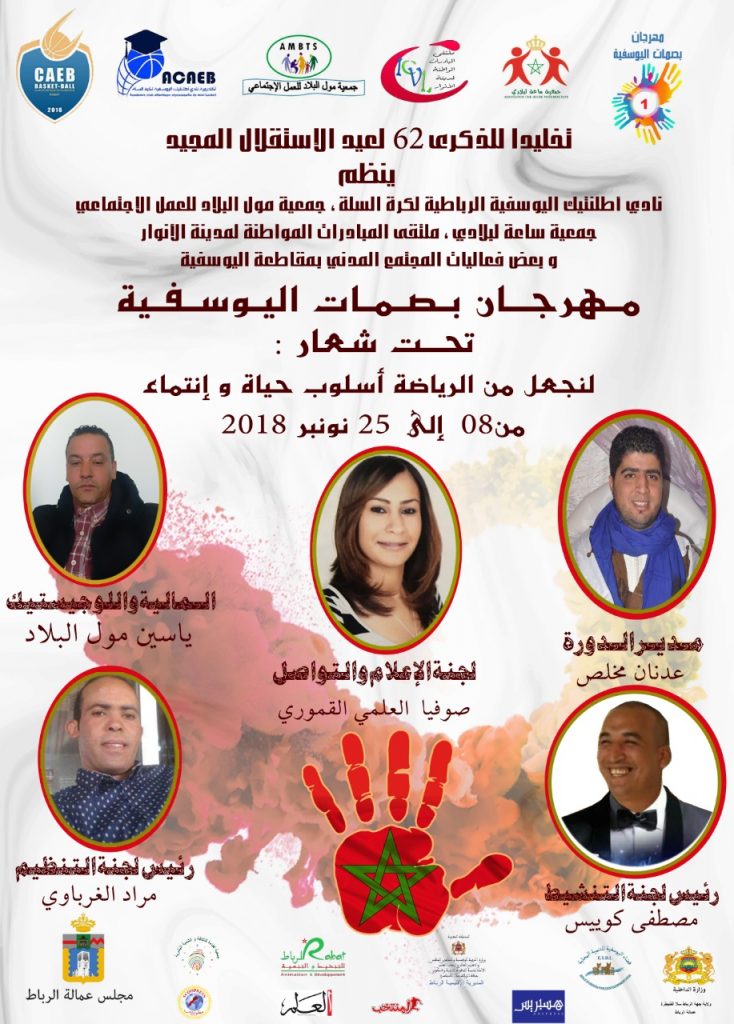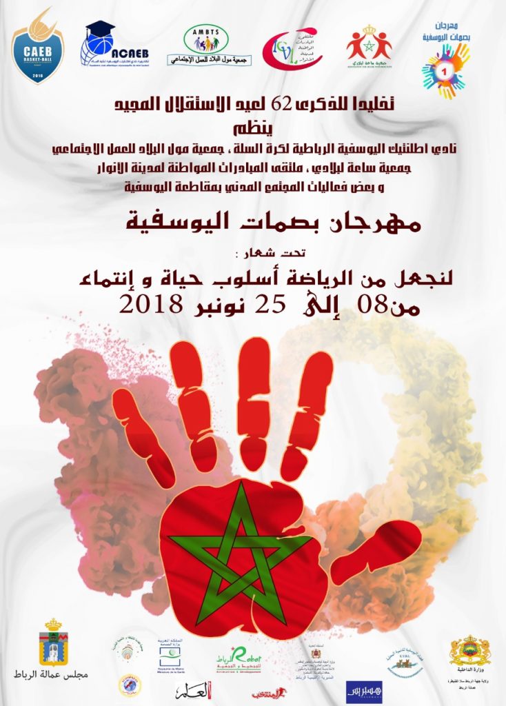 تخليدا لذكرى 62 لعيد الاستقلال المجيد تنظم مجموعة من الفعاليات المدنية النشيطة بمقاطعة اليوسفية بدعم من مجموعة من الشركاء , فعاليات الدورة الأولى لمهرجان بصمات اليوسفية وذلك خلال الفترة الممتدة بين 8 و 25 نونبر 2018 تحت شعار : لنجعل من الرياضة أسلوب حياة وانتماء.