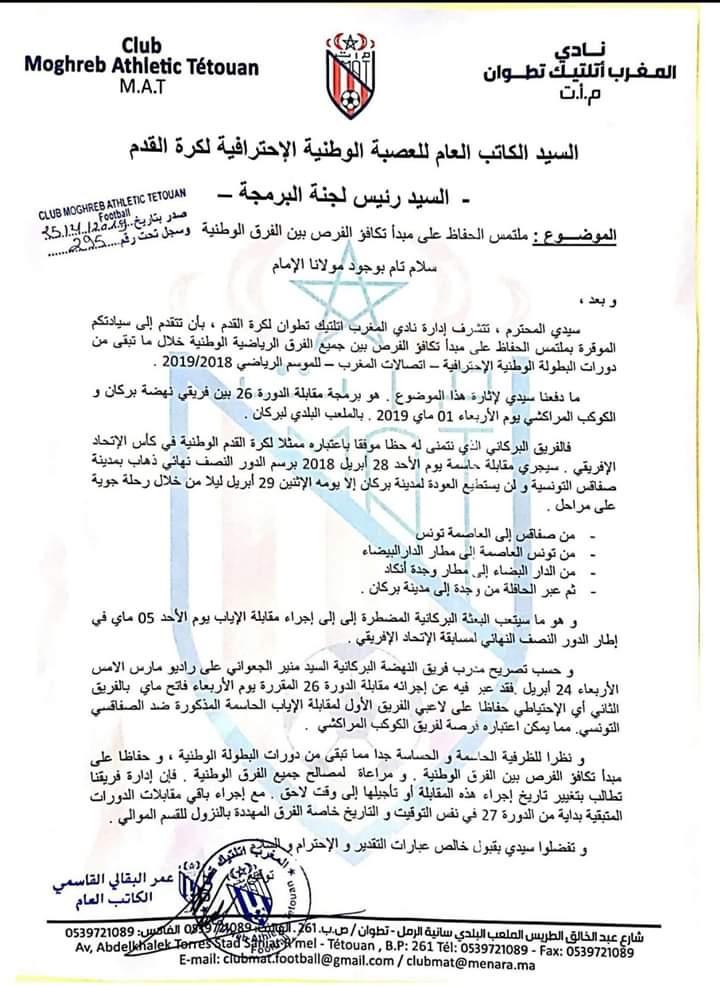 بعث نادي المغرب التطواني بمراسلة إلى العصبة الاحترافية لكرة القدم، بخصوص مبدأ تكافؤ الفرص بين الأندية خلال ماتبقى من مباريات الموسم الرياضي الجاري. و على الخصوص مسألة عدم تأجيل مباراة النهضة البركانية أمام الكوكب المراكشي عن الدورة 26 ،بحكم أن الفريق البركاني لديه رحلة إلى الصفاقس التونسية لخوض مباراة نصف نهائي كأس الكاف يوم الأحد القادم ،و تمت برمجة مباراته عن البطولة أمام الكوكب يوم الأربعاء الموالي ، ما سيتيح للفريق البركاني إشراك عناصر الفريق الثاني خلال هذا النزال، الشيء الذي يعتبره مسؤولو المغرب التطواني مسألة غير طبيعية، حيث ستكون فرصة للكوكب المراكشي من أجل الظفر بنقط المباراة.